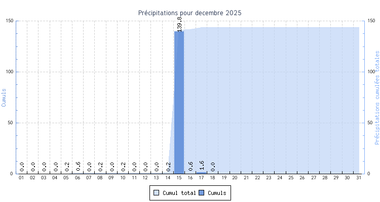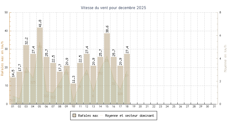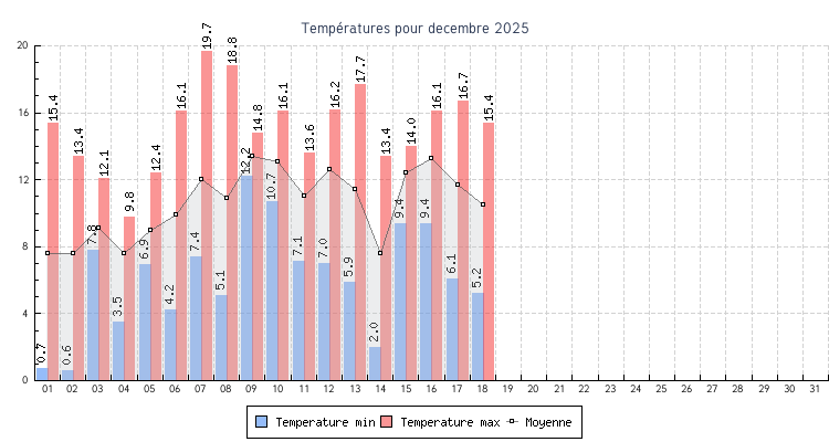 | 01 | 0.7 °C à 23:55 | 15.4 °C à 14:57 | 7.6 °C | 0.7 km/h (14.5 km/h) | 307 |